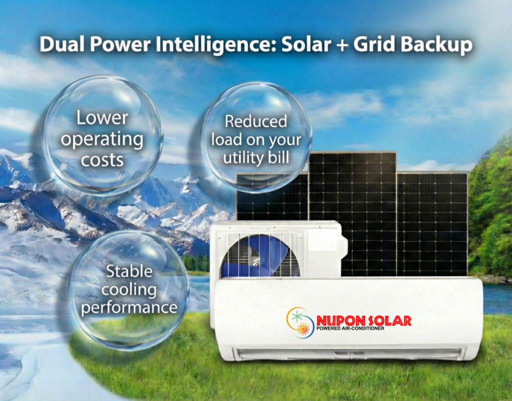 The NuPON Full DC Hybrid Solar Air Conditioner intelligently uses both solar power and grid electricity to ensure reliable cooling while maximizing energy savings.